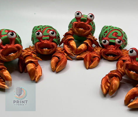 Meet your new desk companion! This cheerful hermit crab features oversized expressive eyes and a uniquely tattooed shell that's bursting with personality. Crafted through precision 3D printing with articulated joints, it's fully poseable—twist, turn, and position it however you like. Perfect for adding a splash of quirky charm to your workspace, shelf, or collection. A delightful conversation starter that brings a smile every time you glance its way.